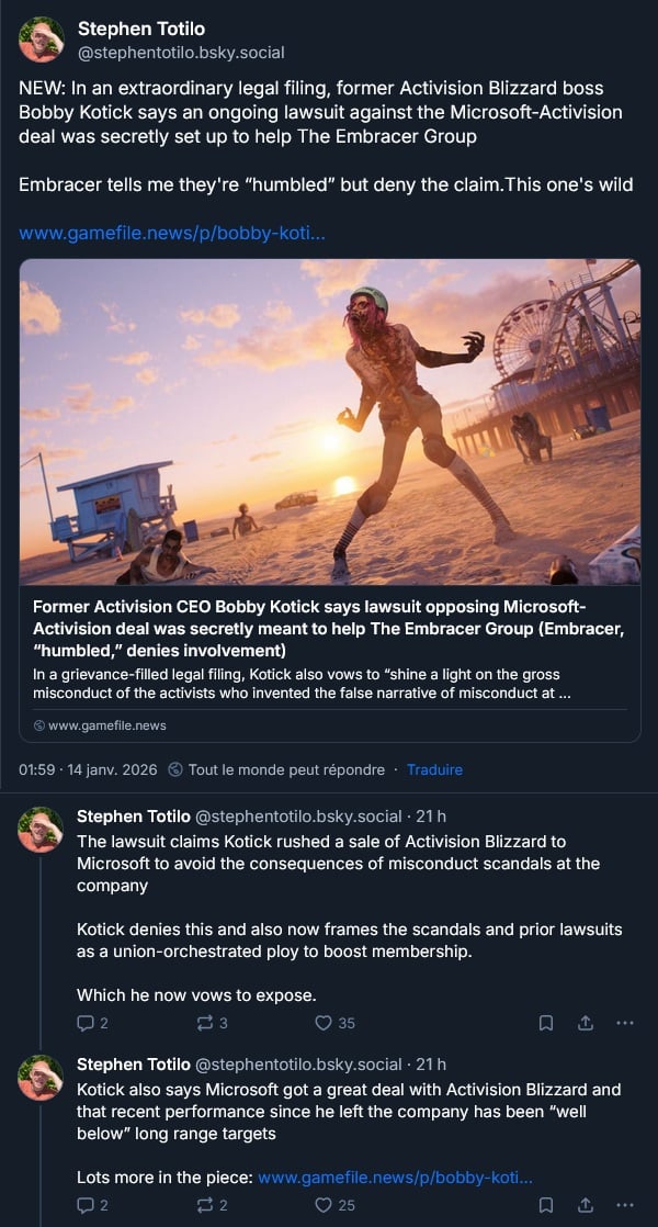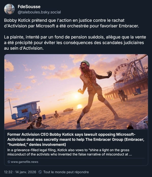 Bobby Kotick dit que même pas vrai qu’il a vite vendu Activision-Blizzard-King à Microsoft pour ne pas subir les conséquences de sa gestion désastreuse des multiples affaires de harcèlement dans la compagnie. Et qu’en fait, c’est Embracer qui a monté la poursuite pour bloquer l’acquisition par Microsoft pour une raison alambiquée (et parce qu’elle vient en fait d’un fond de pension suédois) … Embracer se dit flatté par la suggestion d’être mêlé à cette affaire mais que non. Et évidemment, les affaires de harcèlement sont aussi un complot des syndicats selon le pauvre innocent Bobby :