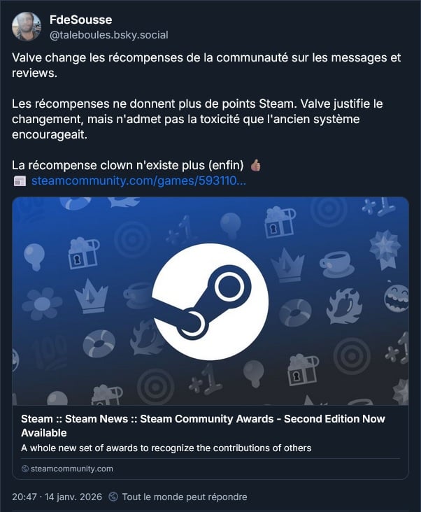 Steam n’offre plus des points Steam pour donner des avis sur Steam :
