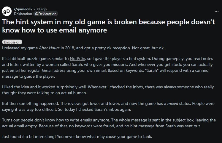 L’ARG After Hours a un système d’aide automatisé via des réponses automatiques à des emails … Sauf que les djeuns écrivent leurs demandes d’aide directement dans le titre de l’email, et que le système ne les prend pas en compte :