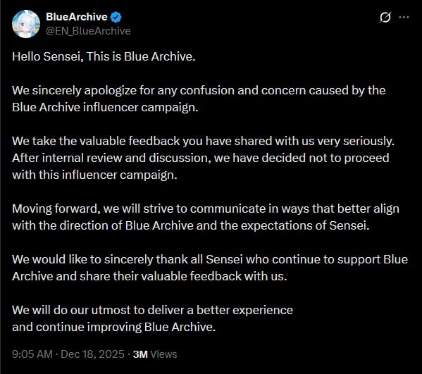 L’action-RPG free-to-play Blue Archive a voulu lancer une campagne promotionnelle avec 4 streameurs. La communauté a fait savoir sur Twitter de la manière calme et posée habituelle qu’elle trouvait que les streameurs choisis étaient des touristes sur le jeu. Du coup, la campagne est annulée :