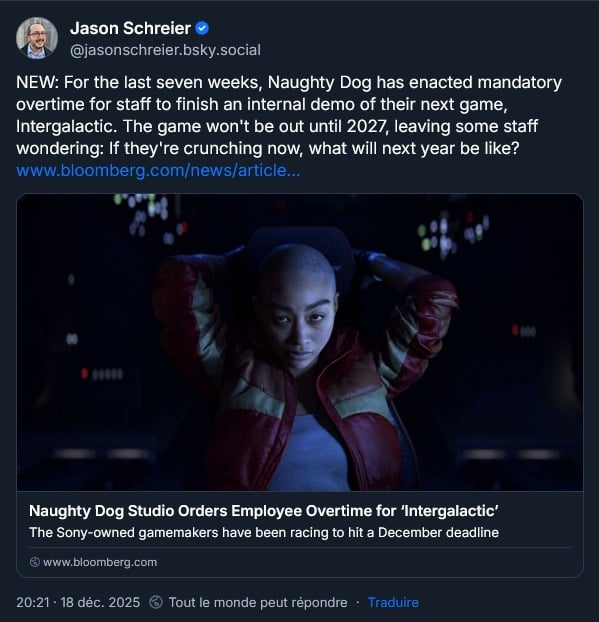 Naughty Dog a imposé 8 heures supplémentaires minimales obligatoires par semaine depuis 6 semaines, avec un maximum de 60h de travail par semaine, avec 5 jours de présence dans les bureaux au lieu de 3, pour une démo interne d’Intergalactic, qui a été finie cette semaine :