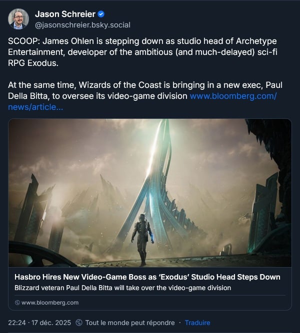 James Ohlen quitte sa place de directeur d’Archetype Entertainment, et Paul Della Bitta prend la direction de la branche jeu-vidéo d’Hasbro :