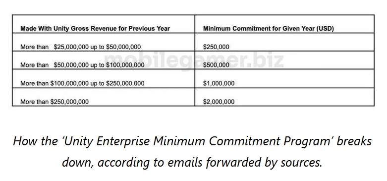 Unity, dont on avait pas trop entendu parlé dans les dernières semaines, augmente ses tarifs l’année prochaine. De 5% le 12 Janvier, avec un engagement minimum de 250.000 à 2 millions de dollars par an pour ses plus gros clients, en fonction des revenus de l’année précédente. Genre, ils vont pas rendre facile le fait de vouloir changer de moteur ou expériementer :