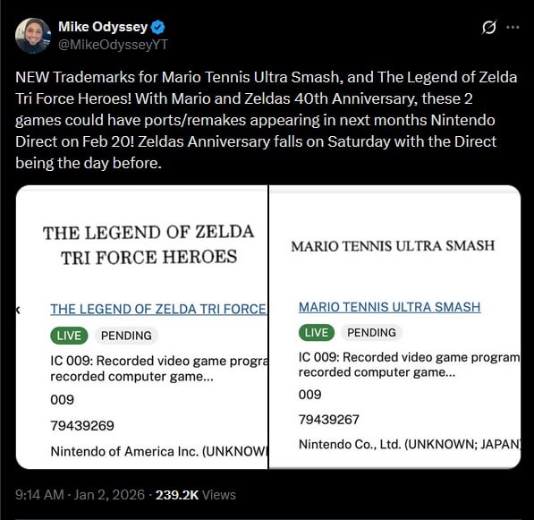 Nintendo a renouvelé les marques The Legend of Zelda: Tri Force Heroes et Mario Tennis: Ultra Smash aux États-Unis, et ça spécule sec :
