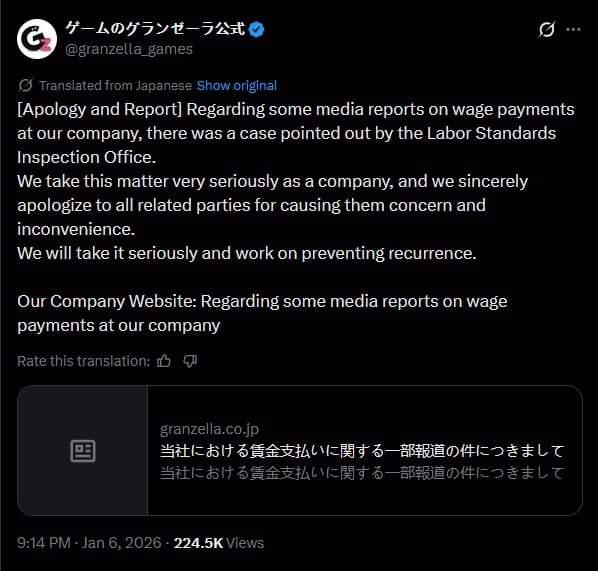 Le studio Granzella, qui a développé Disaster Report 4, a fait une déclaration concernant un avertissement de l’inspection du travail japonaise sur des salaires non-payés et la violation de la loi sur le salaire minimum :
