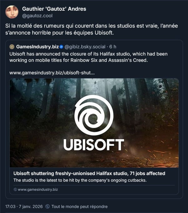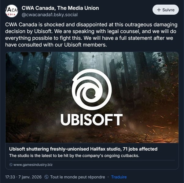 Ubisoft ferme son studio d’Halifax et licencie 71 personnes. Oui, c’est le studio qui venait de se syndiquer, mais Ubisoft précise que la décision avait été prise avant la syndicalisation :
