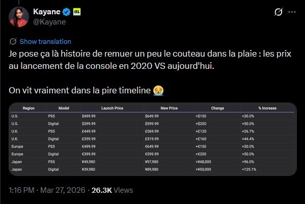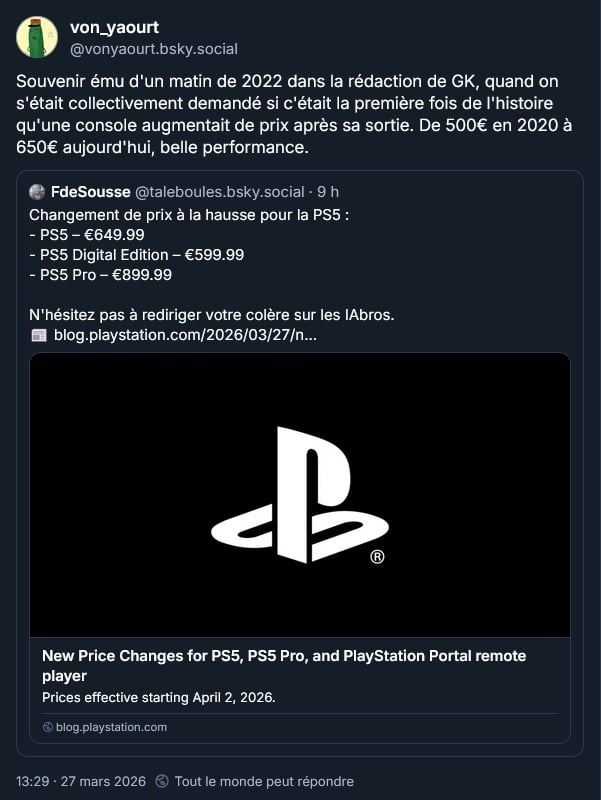 PlayStation va augmenter ses prix le 2 Avril. De 100 euro-dollars pour les PS5 de base, de 150 euro-dollars pour la PS5 Pro, et de 30 euro-dollars pour le PS Portal :