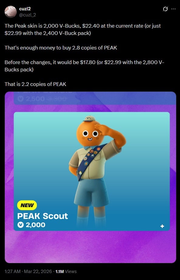 Comparaison entre le prix de PEAK et le prix des skins PEAK sur Fortnite :