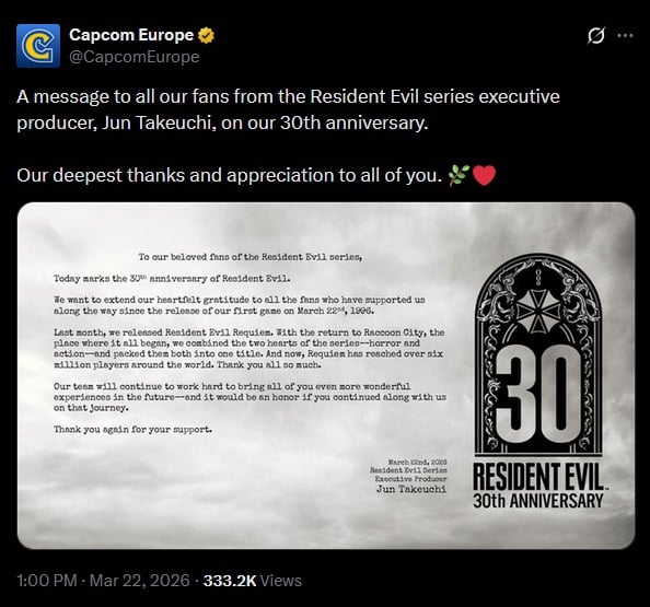 Le message de Capcom pour les 30 ans de Resident Evil :