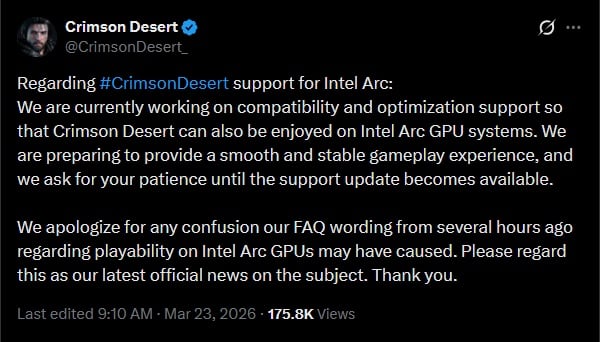 Crimson Desert travaille sur son problème de non-fonctionnement complet sur les cartes graphiques Intel Arc :