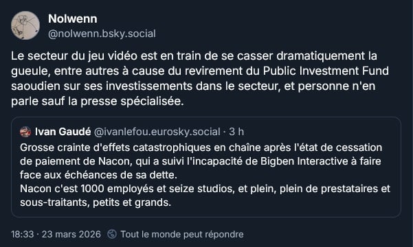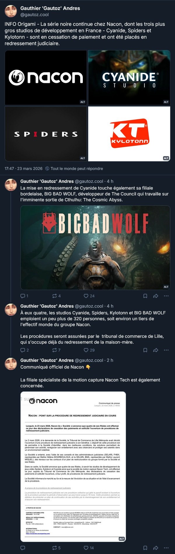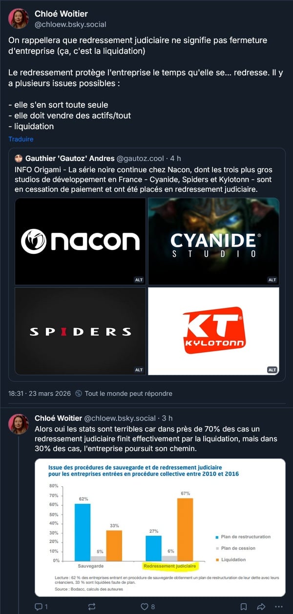 Les studios Cyanide, Spiders et Kylotonn, qui appartiennent tous à Nacon, ainsi que Nacon Tech, la filiale motion cpature, sont en cessation de paiement et placés en redressement judiciaire :