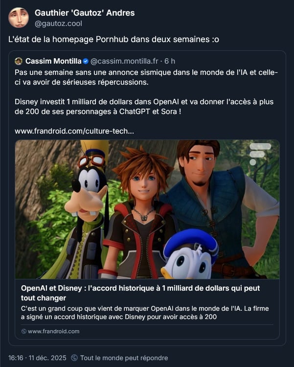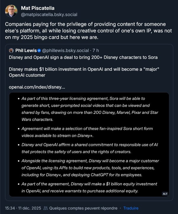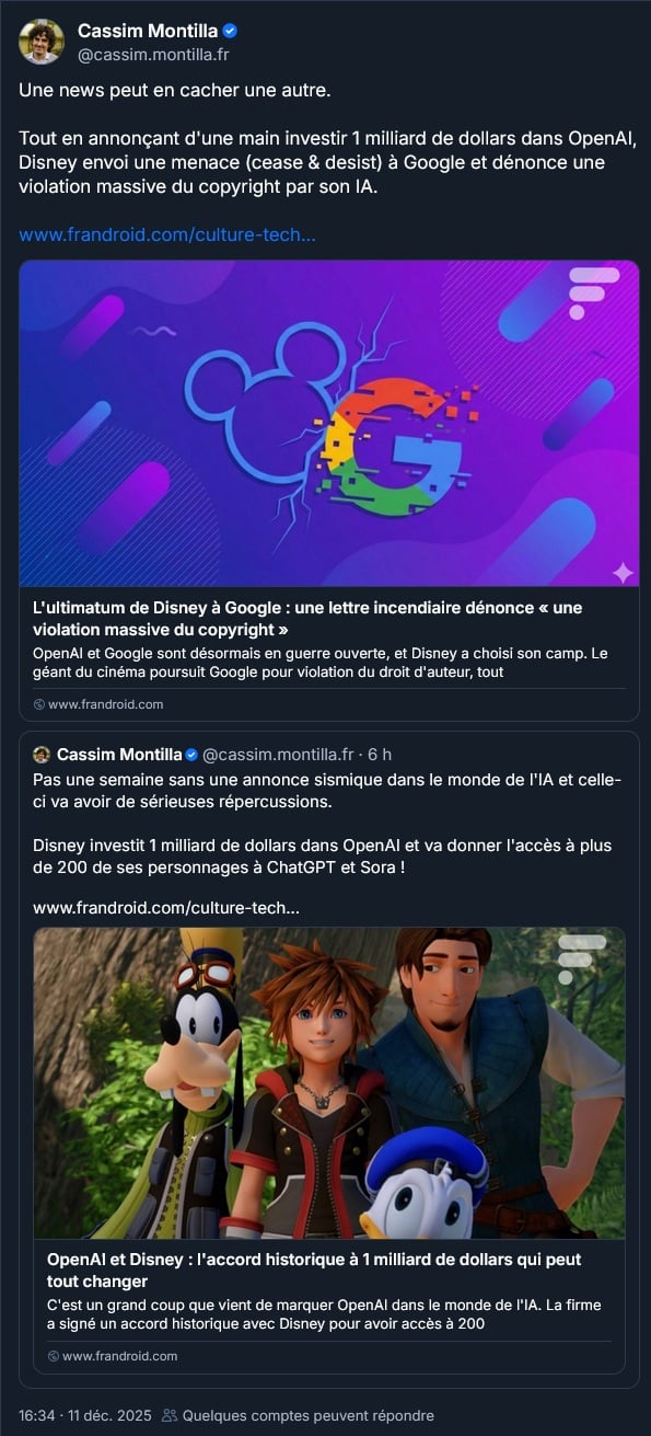 Disney investit 1 milliard de dollars dans OpenAI et donne l’accès à 200 personnages. Et envoie une lettre un poil menaçante à Google pour de grosses violations de copyright :