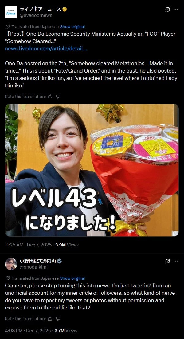 Une ministre japonaise (8 ministères à charge quand même) demande à ce qu’on ne lie pas ses gouts en jeux vidéo (Fate/Grand Order) soit liés à ses positions politiques :