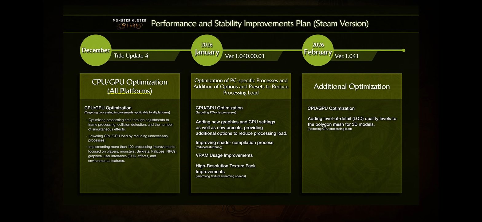 Bande-annonce pour la 4ème mise à jour de Monster Hunter Wilds, qui sera déployée le 16 Décembre et rajoutera une partie des améliorations de performance pour le PC, le reste étant pour Janvier et Février 2026 :