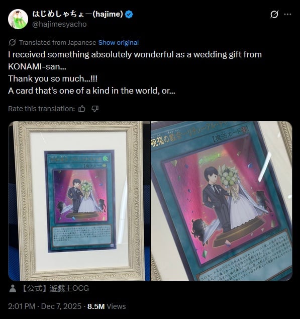 Konami a envoyé une carte Yu-Gi-Oh! unique à un créateur de contenu japonais pour son mariage :