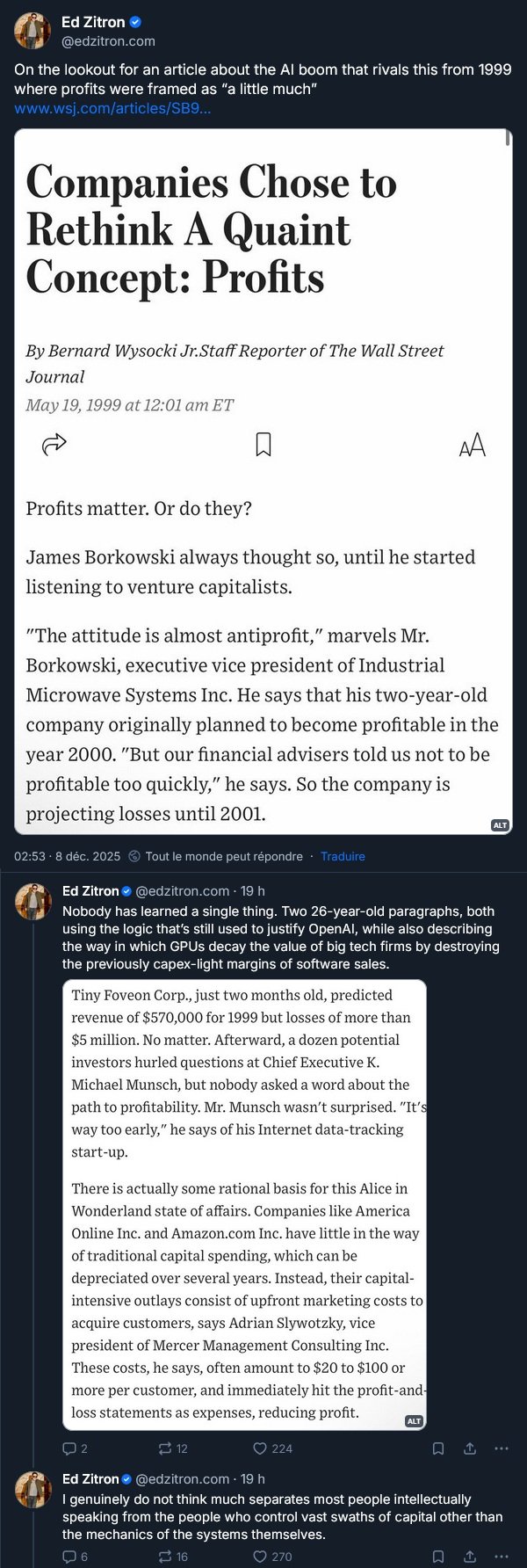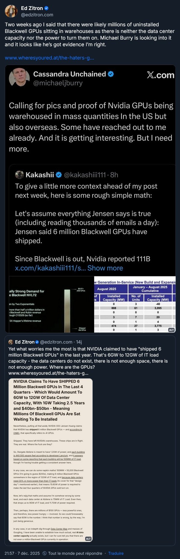 Vous savez, tous les processeurs IA que Nvidia vend à grand prix en ce moment ? Une grande majorité semblant attendre dans des hangars que les data-centers soient construits. Ce qui prend 2 à 3 ans en se pressant. Le temps que les processeurs soient obsolètes :