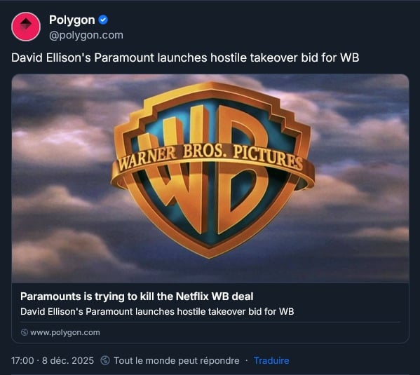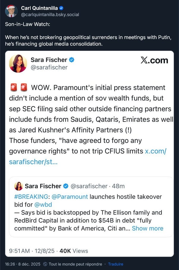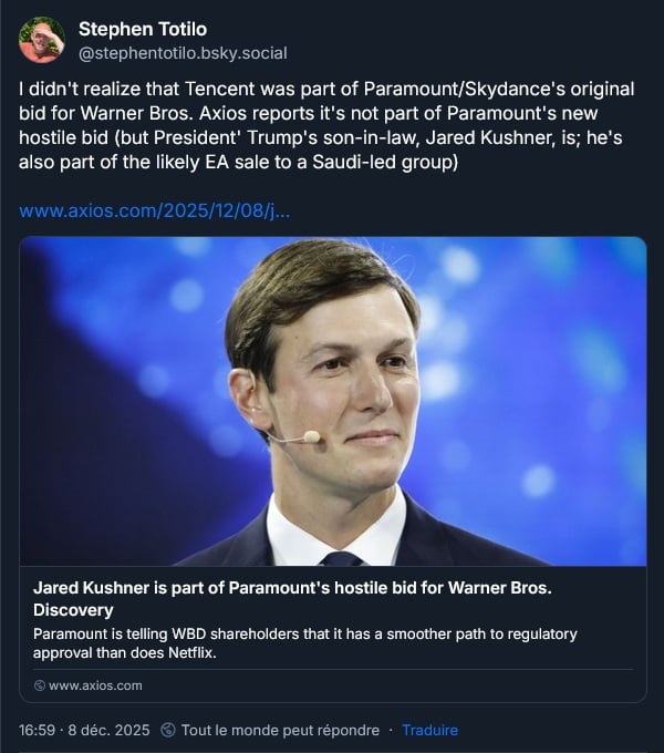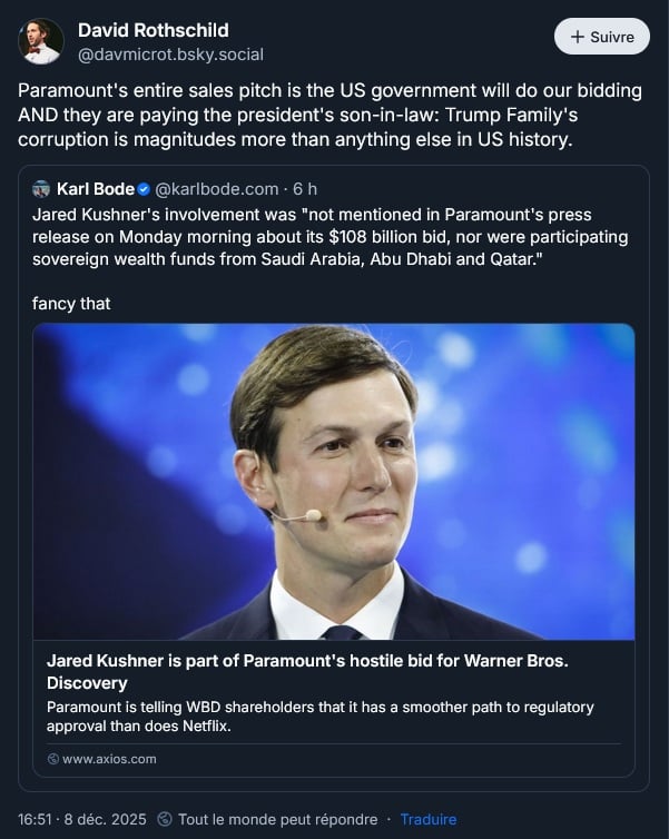 Après, y a aussi Paramount qui tente une OPA hostile à 108.4 milliards de dollars avec le soutien de l’Arabie Saoudite, Abu Dhabi, le Qatar et le gendre du mec orange, là pour tenir les pompons. Et prendre de la thune au passage, probablement :