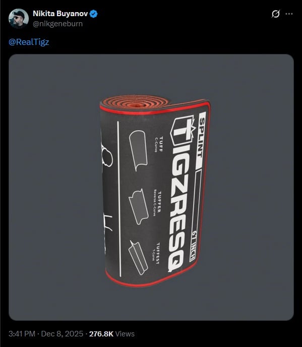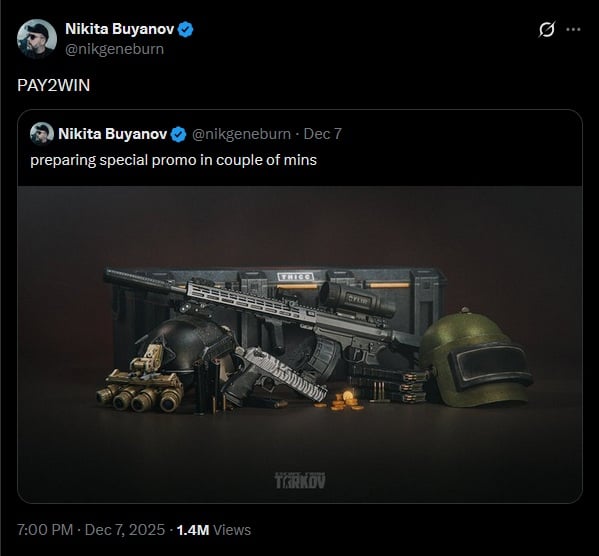 Nikita Buyanov, dirigeant de Battlestate Games, a donné un code pour recevoir du matos dans Escape From Tarkov. Avec une photo d’équipement de luxe, alors que l’équipement offert était tout pourri :