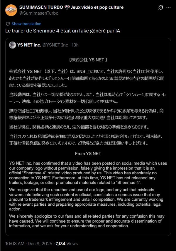 La bande-annonce de Shenmue 4 était bien un machin généré par IA :