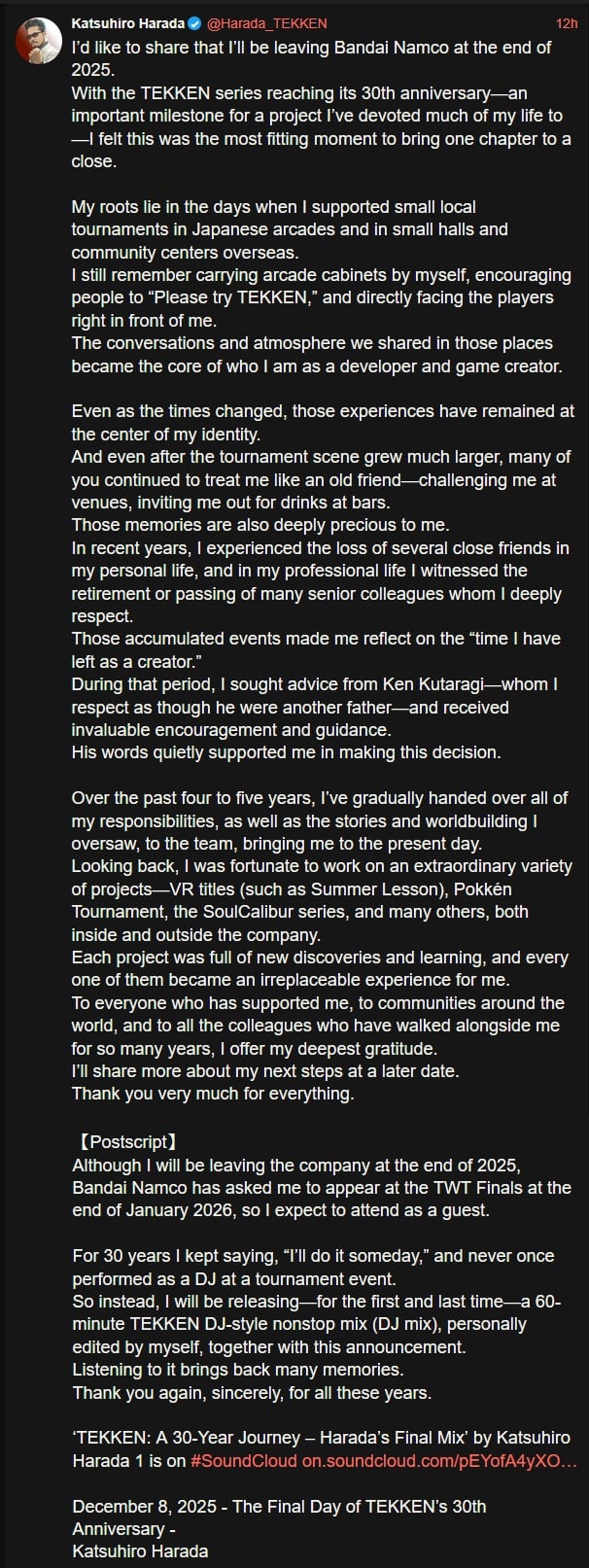Katsuhiro Harada quitte Bandai-Namco à la fin de l’année. Et a fait un mix spécial Tekken sur Souncloud :