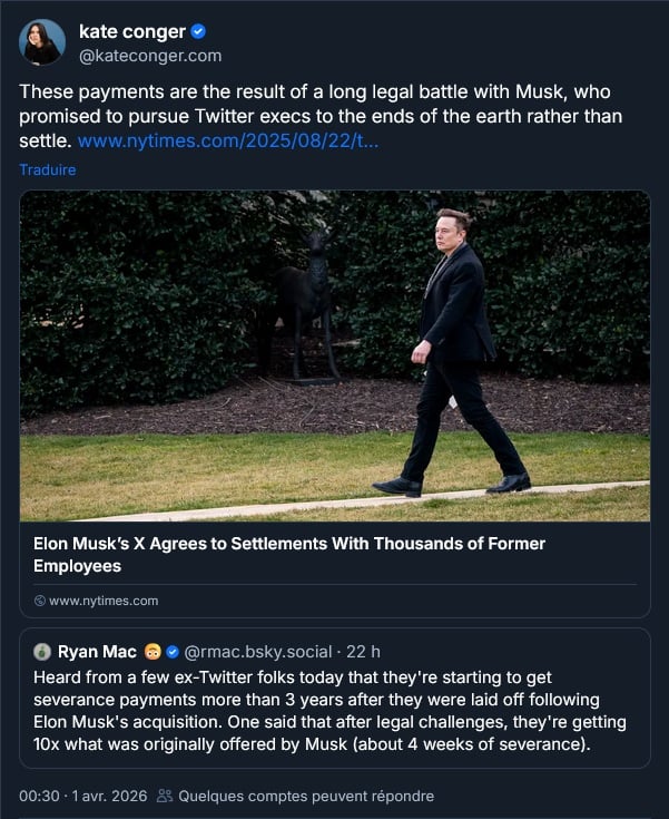 Elon commence enfin à payer les indemnités de licenciements des anciens employés de Twitter. Oui, les milliers d’employés virés quand il a acheté le réseau social :