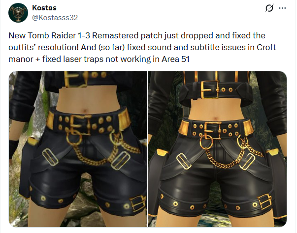 C’est le jour de la mise à jour pour Tomb Raider 1-3 Remastered, qui arrange les costumes tous moches de la dernière mise à jour. Ceux que les joueurs avaient pris pour le la grosse IA bien moche :