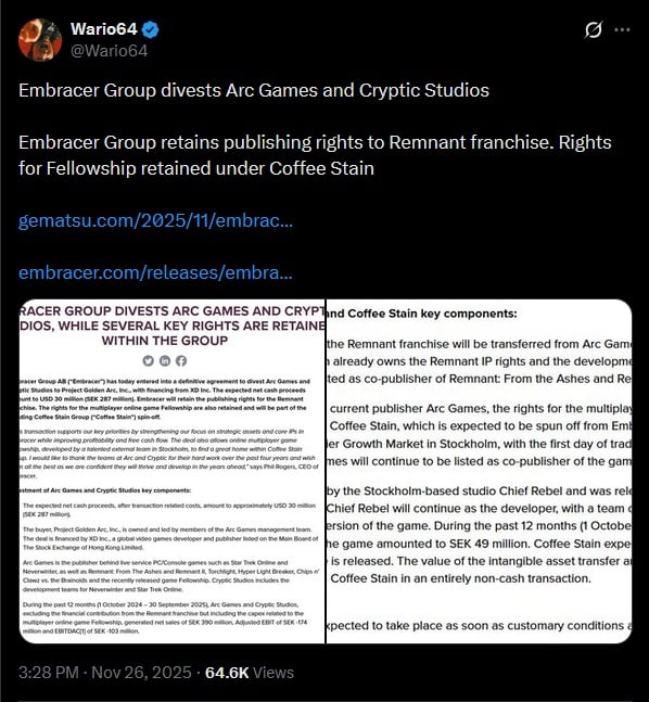 Embracer a vendu Arc Games et Cryptic Studios. Et garde les droits de Remnants :