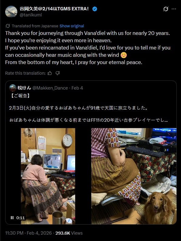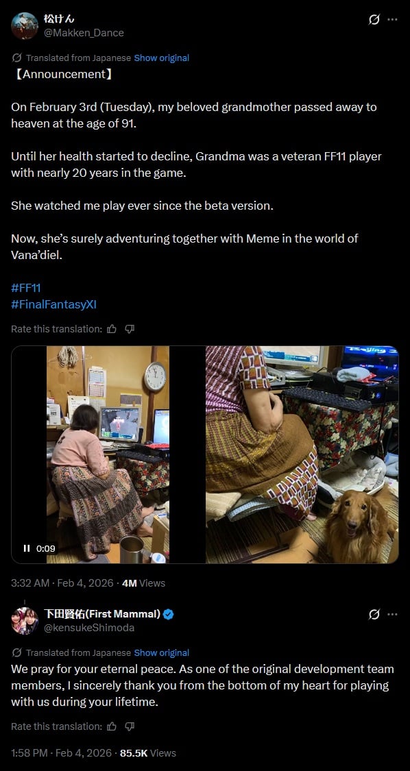 Une grand-mère de 91 ans jouant à Final Fantasy XI depuis 20 ans est décédée. Les développeurs ont présenté leurs condoléances :