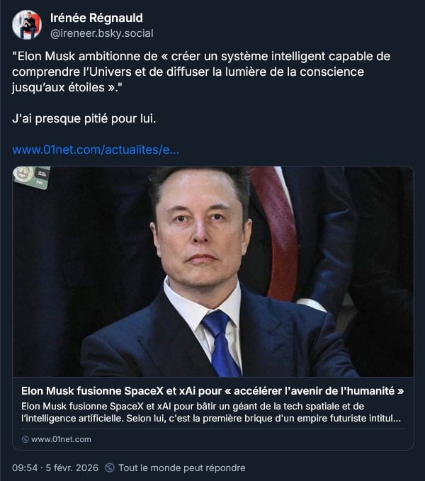 La situation de SpaceX. Qui achète xAI parce que xAI brule du pognon sans en gagner ou presque :