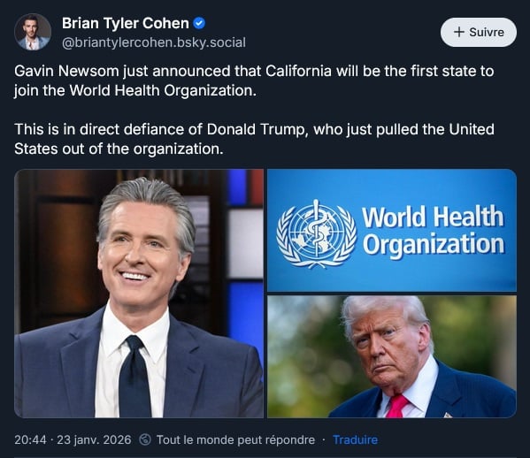 Gabin Newsom a annoncé que la Californie allait rejoindre l’Organisation Mondiale de la Santé :