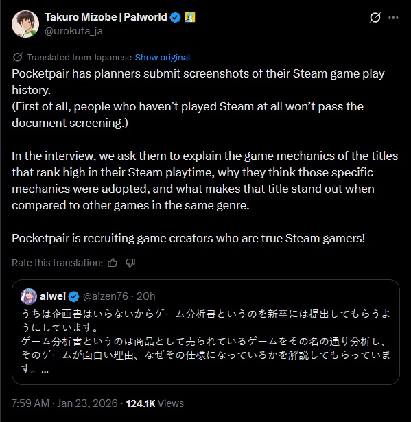 Le CEO de Pocketpair demande à vérifier que le temps de jeu sur Steam des candidats à un emploi soit suffisamment élevé pour qu’elles soient considérées :