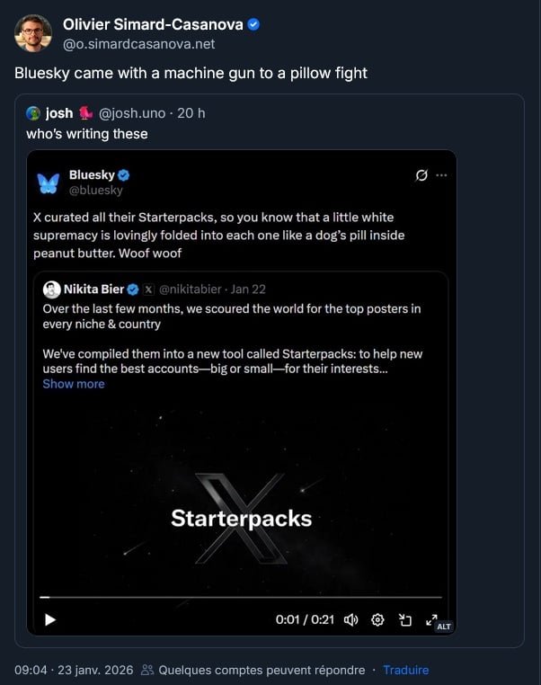Bluesky a un commentaire à propos des starterpacks de Twitter :