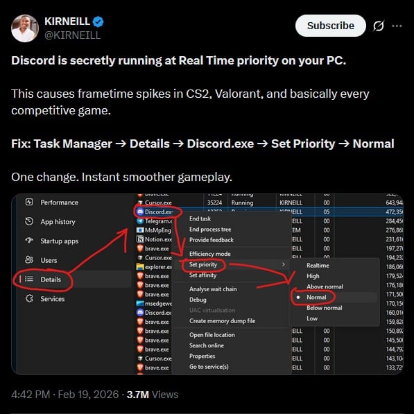 Discord tourne en priorité haute sur Windows, ce qui peut avoir un effet sur les fps, surtout pour les FPS compétitifs :