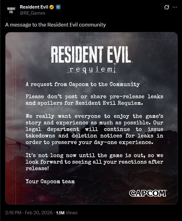 Capcom demande de ne pas partager les spoils sur Resident Evil Requiem qui sort le 27 Février sur Steam, l’Epic Games Store, PS5 et Xbox Series :