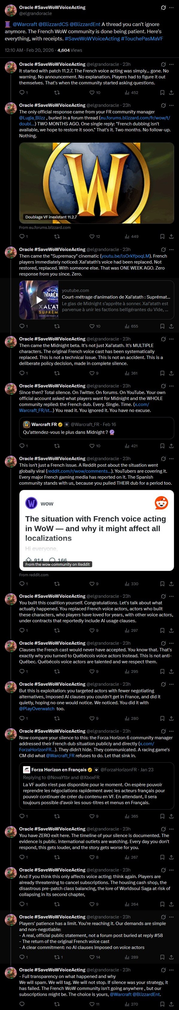 Un thread Twitter à propos de ce qu’il se passe avec les voix françaises sur World Of Warcraft :