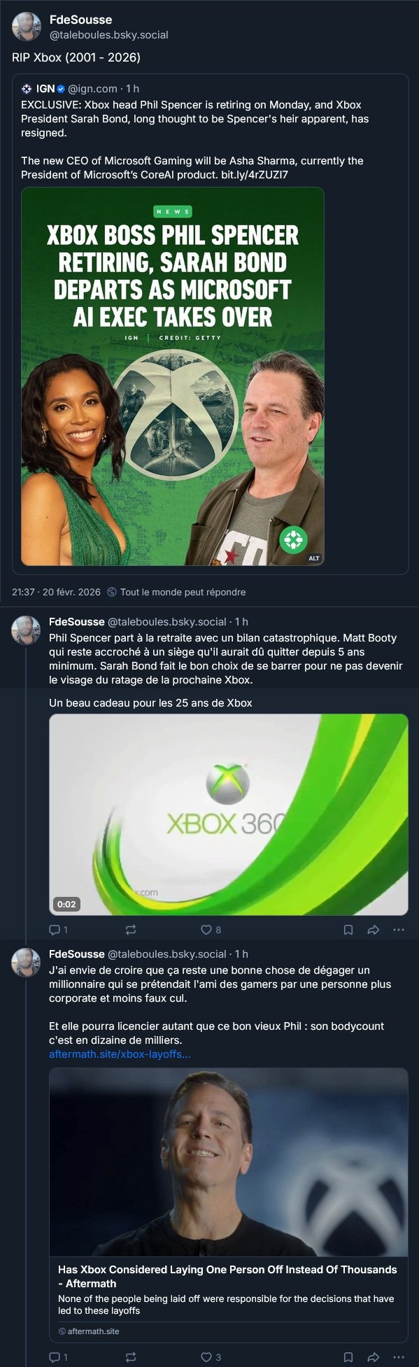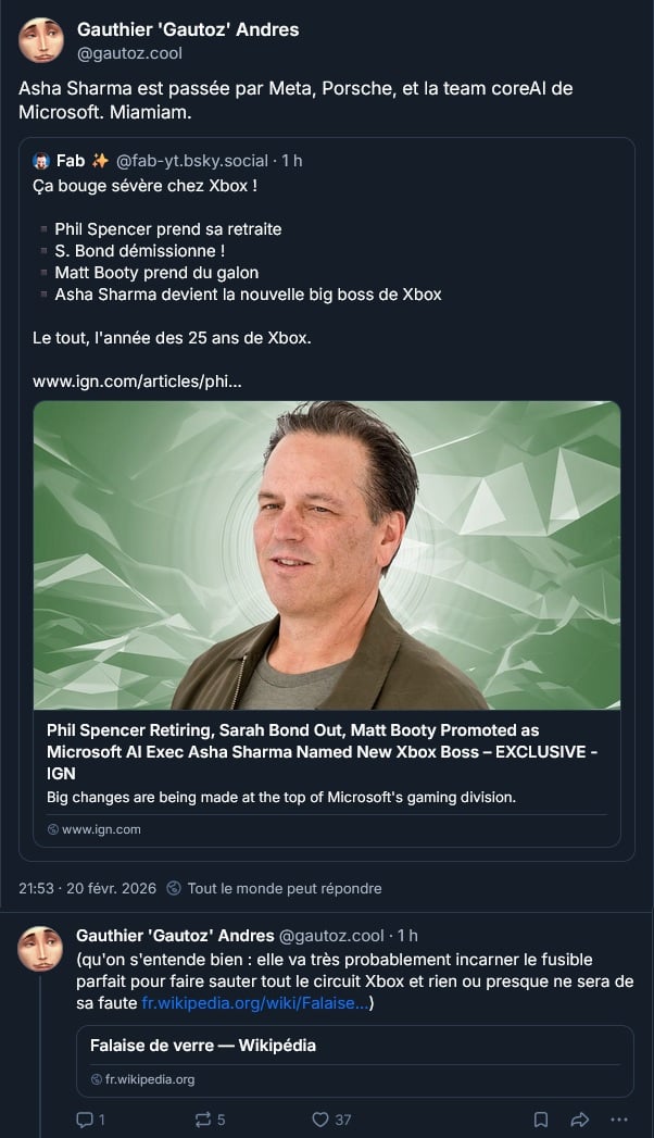 Sarah Bond quitte Xbox et Phil Spencer quitte son poste de chef pour rester conseiller jusqu’à cet Été. Asha Sharma, actuelle chef de l’IA chez Microsoft, va prendre la place de Philou :