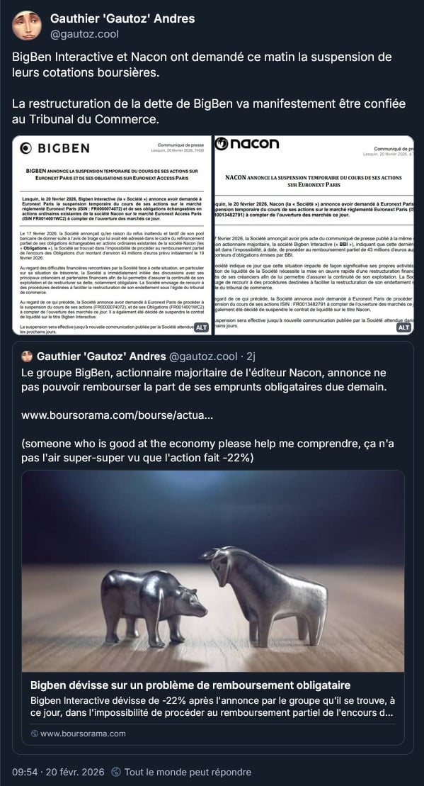 Bigben et Nacon demandent la suspension du cours de leurs actions en raison de leur impossibilité de payer leur dette :