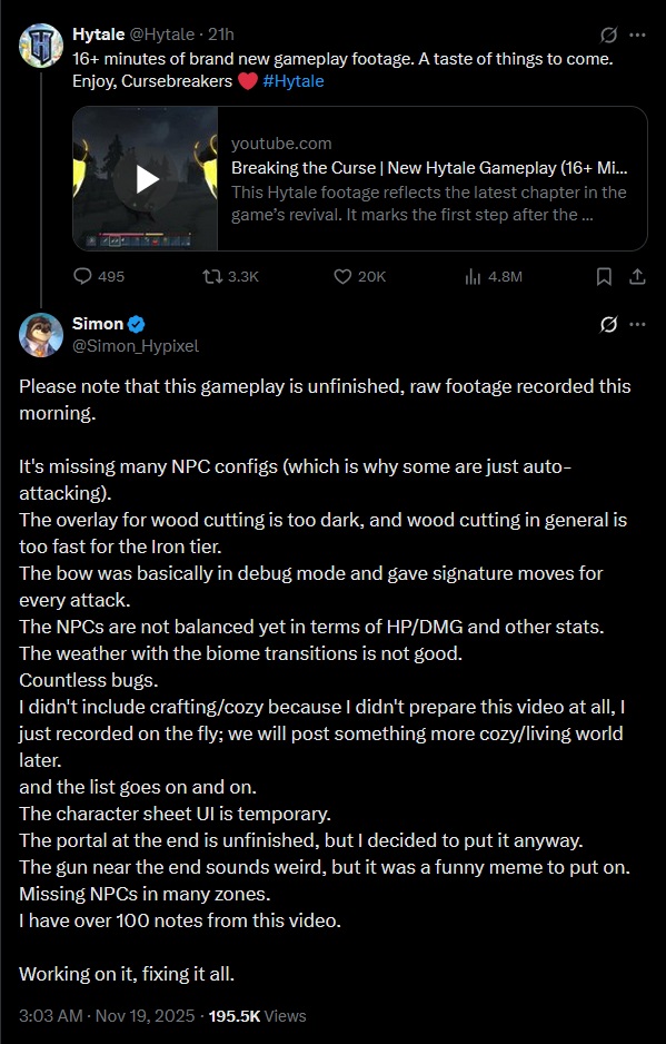 Du gameplay pour Hytale, dont le développement vient de reprendre :