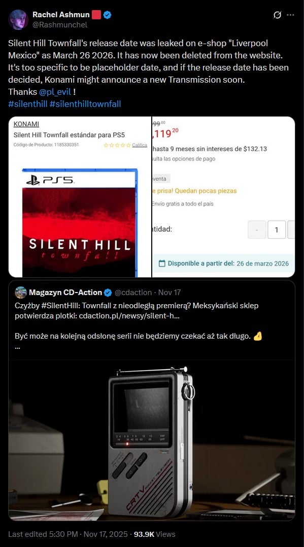 Selon le site de vente en ligne Liverpool Mexico qui aurait laissé échappé une page, Silent Hill Townfall sortirait le 26 Mars 2026 sur Steam, PS5 et Xbox Series :