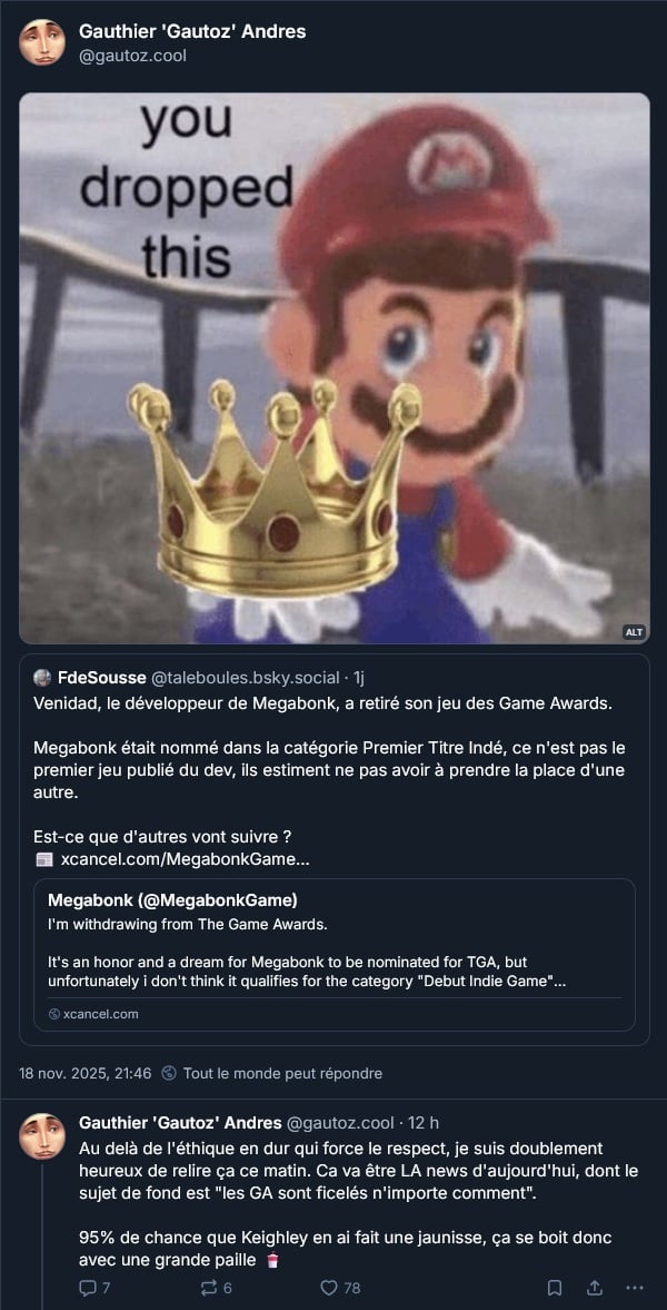 Ce qui est important dans les Game Awards, ce ne sont pas les Game Awards, mais les bandes-annonces. Dispatch est tombé pile-poil au mauvais endroit. Et les polémiques autours des nominations de Clair Obscur: Expedition 33 dans plein de catégories. Et qu’est-ce que c’est, un jeu indé, au juste ? :