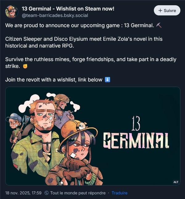 Le RPG narratif et historique 13 Germinal sort en 2026 sur Steam :