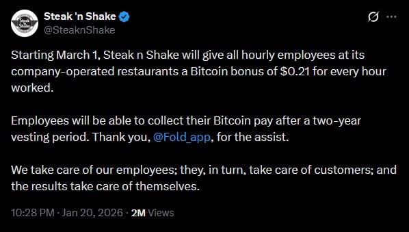 La chaine de restaurants états-uniens Steak ‘n Shake a annoncé un bonus pour ses employés payés à l’heure. De 0.21$ par heure. Payés en Bitcoin. Récupérable uniquement après 2 années complètes de travail dans la chaine :