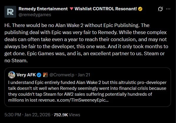 Remedy tient à préciser devant les esprits chafouins que sans le financement et le contrat d’Epic Games, il n’y aurait pas eu d’Alan Wake 2 :