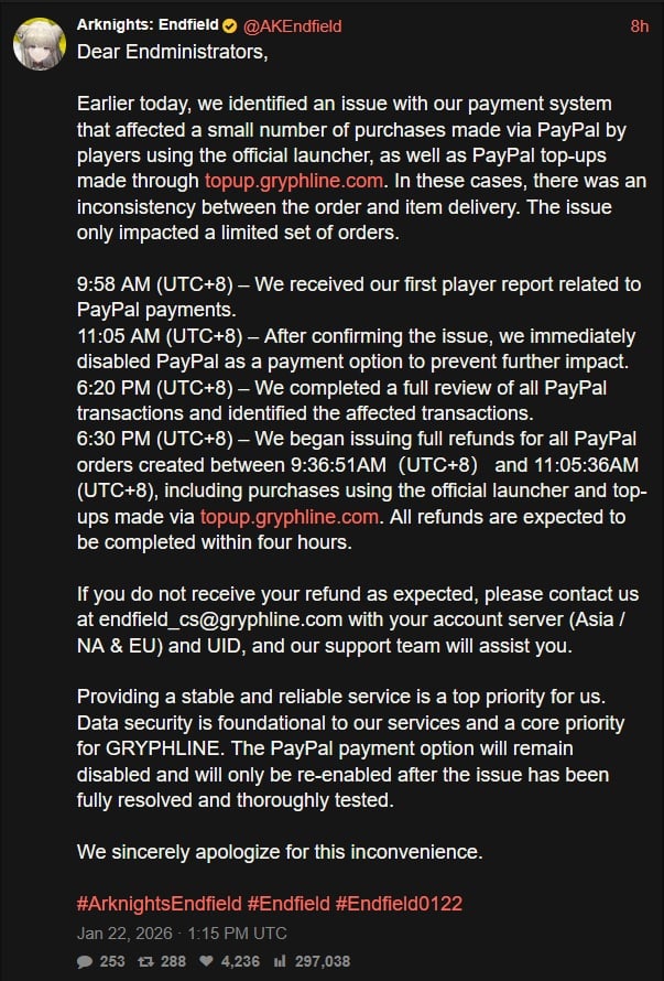 Le gatcha Arknights: Endfield est sorti hier. Et a coupé ses microtransactions après que certains joueurs se soient vus aléatoirement facturés des milliers de dollars sur Paypal sans rien avoir demandé :