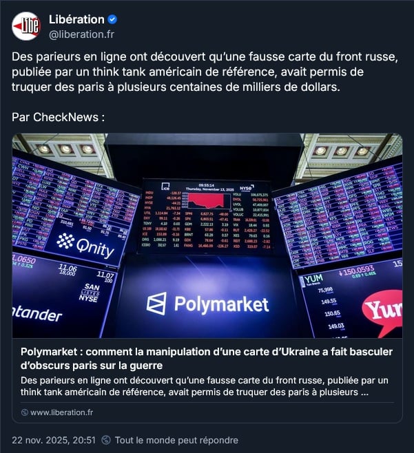 Polymarket permet de parier sur tout. Y compris sur la guerre en Ukraine. Et on peut truquer les pars avec de fausses cartes du front :