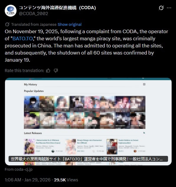 Le site de piratage de mangas Bato.to et ses succursales ont été fermé et leur possesseur arrêté, par la collaboration entre les éditeurs et les forces de l’ordre japonais et chinois :