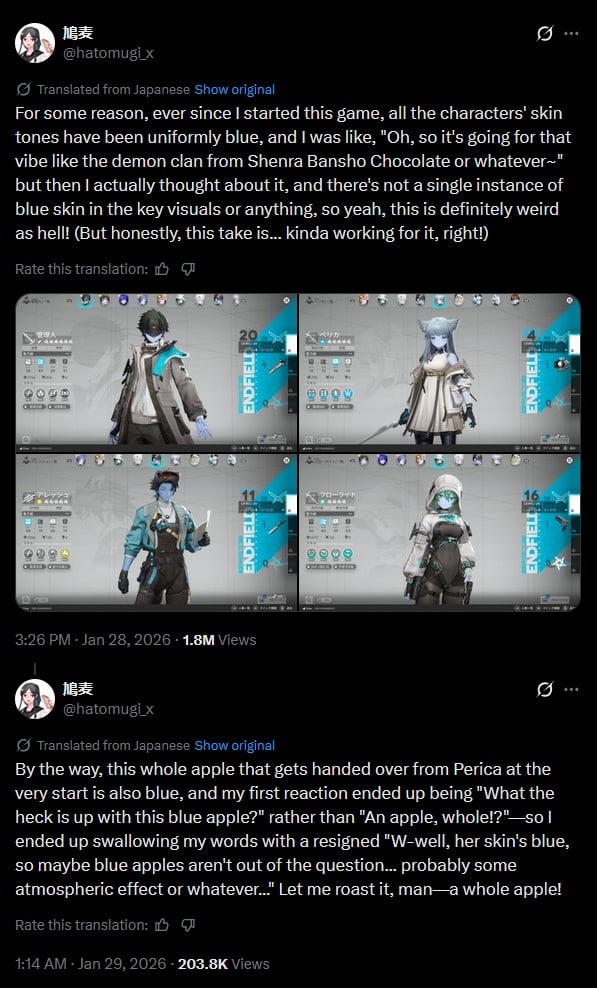 Nouveau bug sur Arknights: Endfield qui ne facture pas aléatoirement des machins cette fois, mais rend juste la peau de tous les personnages bleues :