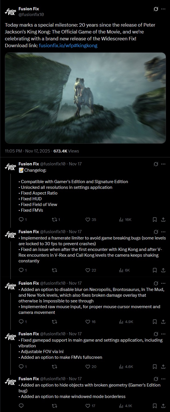 C’est le jour de la mise à jour du mod Widescreen Fix pour Peter Jackson's King Kong: The Official Game of the Movie :