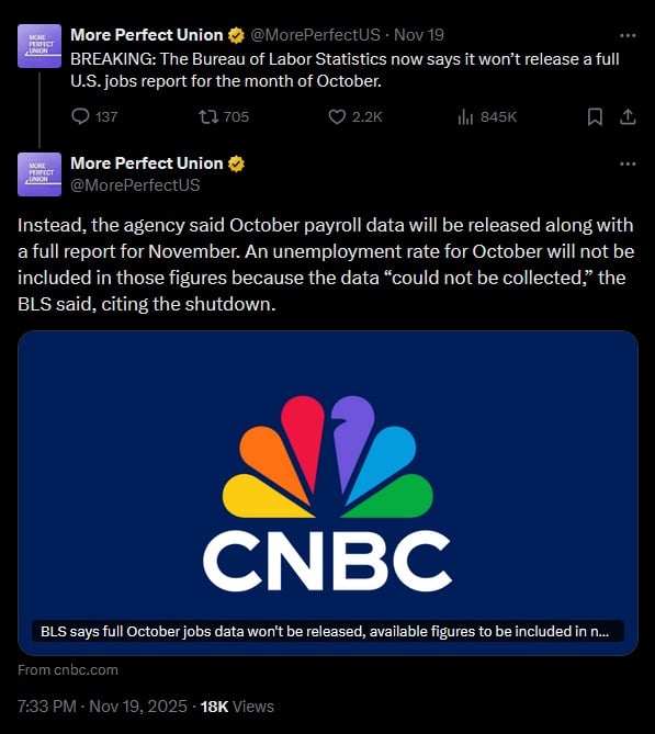En Octobre, le gouvernement états-unien ne fournira pas les chiffres du chômage. Parce que si tu comptes pas, ça n’existe pas. Comme quand Donald dit que tout va bien et que les états-uniens se rendent bien compte de l’augmentation du prix de la Dinde pour Thanksgiving :