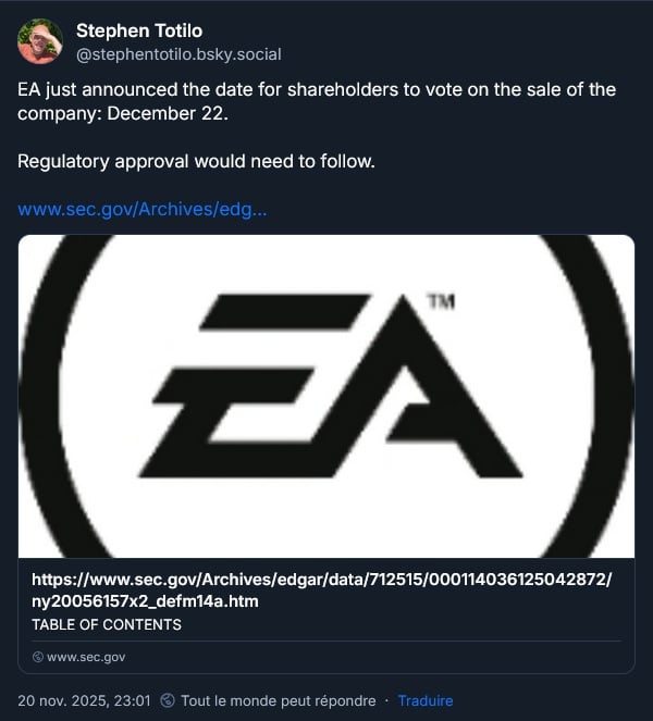 Le vote pour la vente d’Electronic Arts à l’Arabie Saoudite et ses potes aura lieu le 22 Décembre :